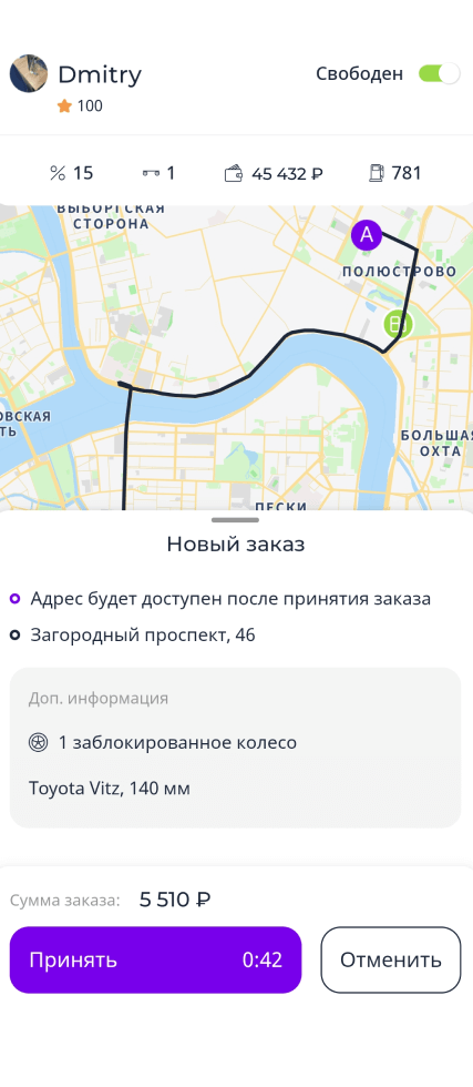 Водитель получает уведомление о заказе, если клиент находится поблизости. Решение, принимать или отказаться от заказа, водитель эвакуатора принимает сам.